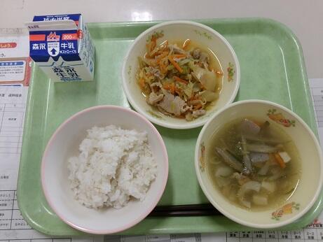 今日の給食:麦ごはん、具だくさん汁、豚肉の生姜焼き、牛乳