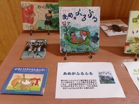 職員玄関前には、図書委員会の児童が選んだ、「今月のおすすめの本」が展示してあります。6月は、雨の本やカタツムリの本が展示してありました。