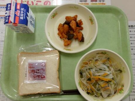 今日の給食:食パン、汁ビーフン、レバーマリアナソース、イチゴジャム、牛乳