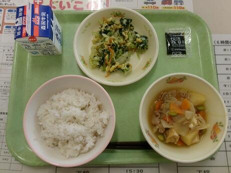 今日の給食:麦ごはん、豚じゃが、千草あえ、ひじきのり佃煮、牛乳