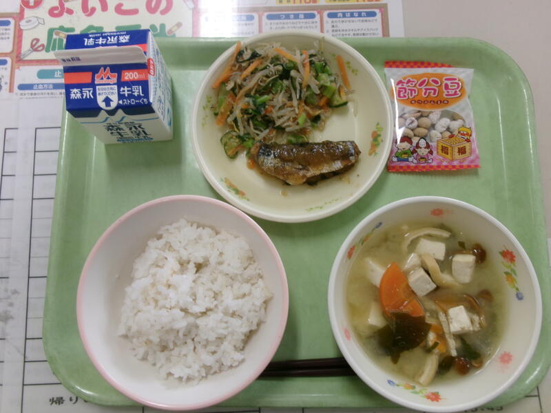 今日の給食:~節分献立~ 麦ごはん、なめこ汁、いわしのみぞれ煮、ごまじゃこあえ、節分豆、牛乳