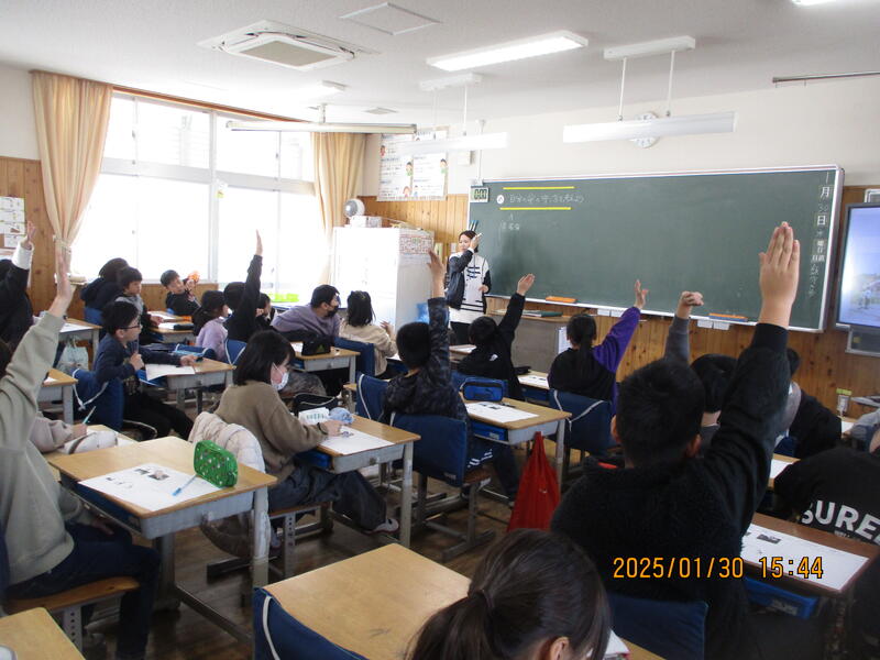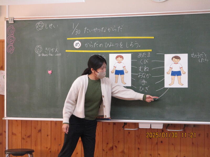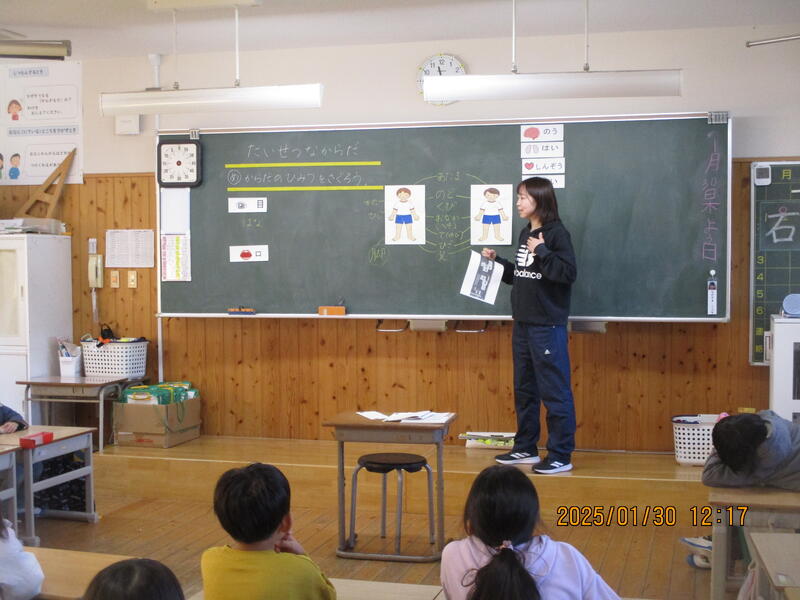 【1年生:1月30日「たいせつなからだ」と「からだをきれいに」の2本立てで授業がおこなわれました。体にはいろいろな器官があり、それぞれ大切なはたらきがあること。体を守るためには、体を清潔にしておくことが必要である、ことなどを学習しました。】