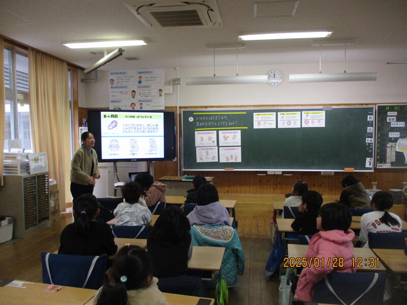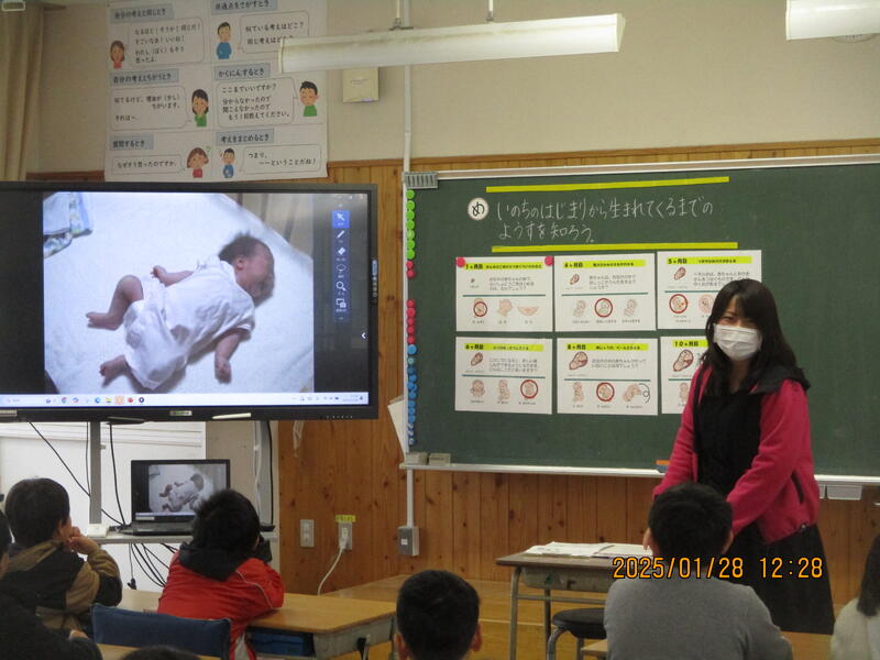 【2年生:1月28日におこなわれました。「わたしのたんじょう」ということで授業が進んでいきました。自分が母親の体の中でどのように育ち、どのように生まれてきたかを学習しました。】