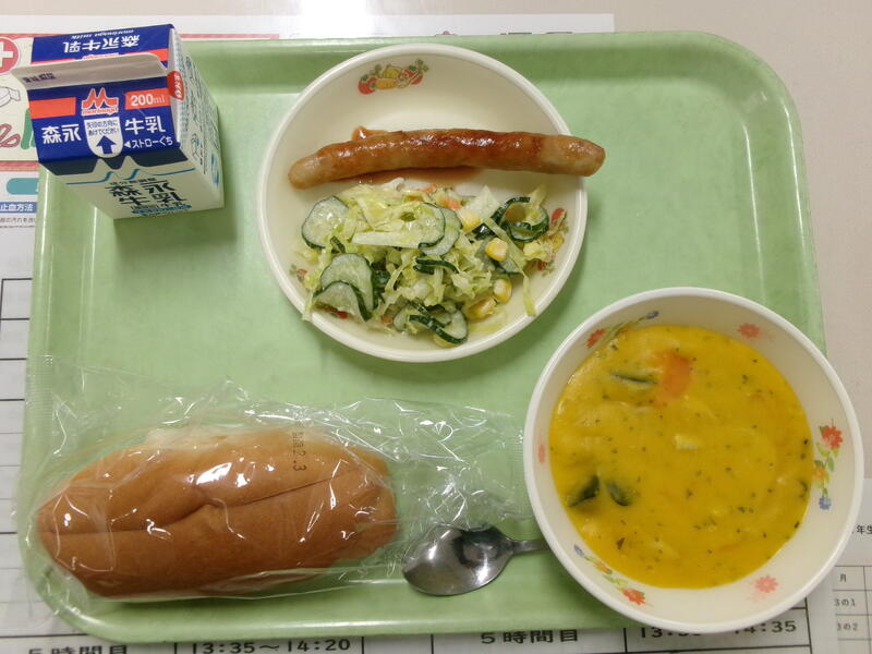 今日の給食:セルフドッグ(コッペパン)、かぼちゃのポタージュ、ウインナー、野菜サラダ、牛乳