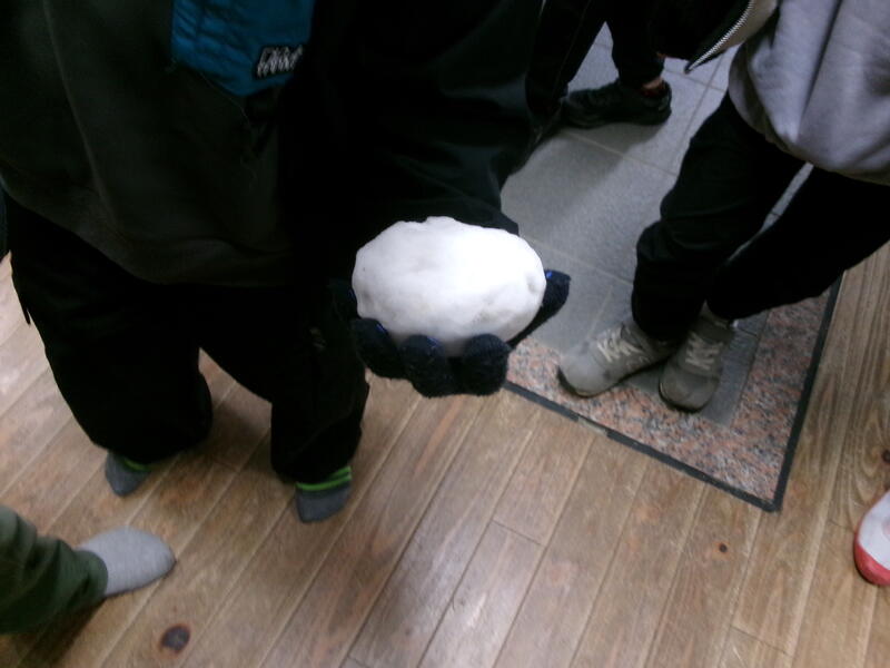 今日は1日中小雪が舞う、寒い1日でしたね。明日はさらに寒くなる予報がでています。十分注意され、お過ごしください。朝から、児童くつばこ前では、子どもたちの元気のよいあいさつが響きわたっています。数名の児童が、少ない雪を集めて、雪の玉や雪だるまをみせてくれました。