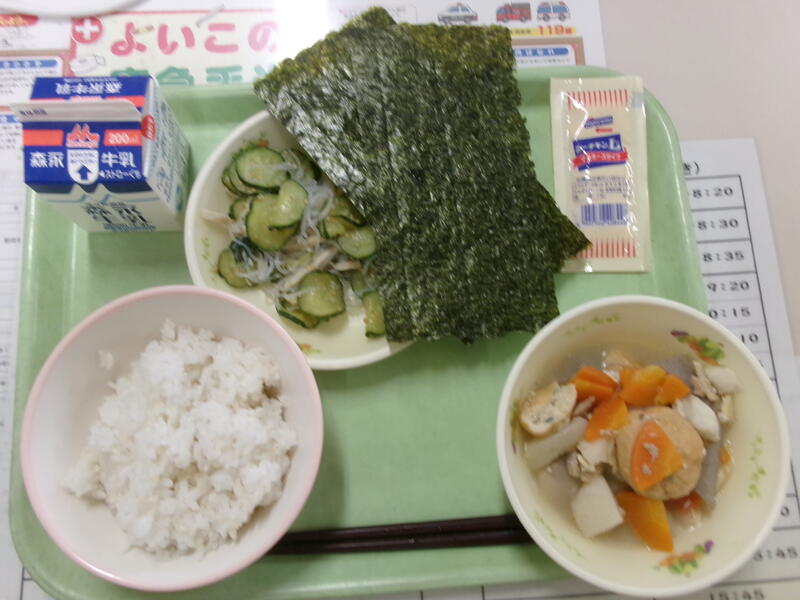 今日の給食:セルフおにぎり、おでん、春雨の酢の物、ツナマヨ、のり、牛乳
