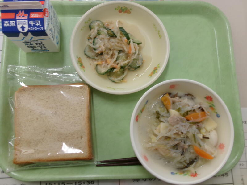 今日の給食:黒糖パン、タイピーエン、バンバンジーサラダ、牛乳