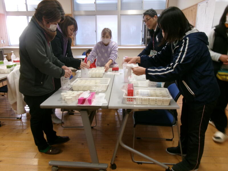 【今日はフッ化物洗口の日です。保護者の皆様に手伝っていただき、会議室で準備をします。いつもありがとうございます。】