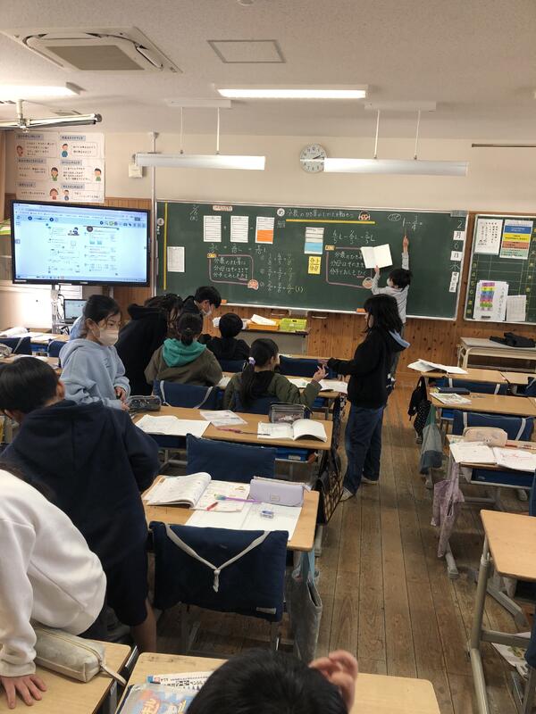 今日も寒かったですね。朝から、子どもたちが雪玉を何個もみせてくれました。午後2時ころには雪が強く舞っていました。その時は、4年生の算数の授業をしていました。30秒間ぐらいみんなで雪をみたあと、小数のかけ算の筆算を練習しました。