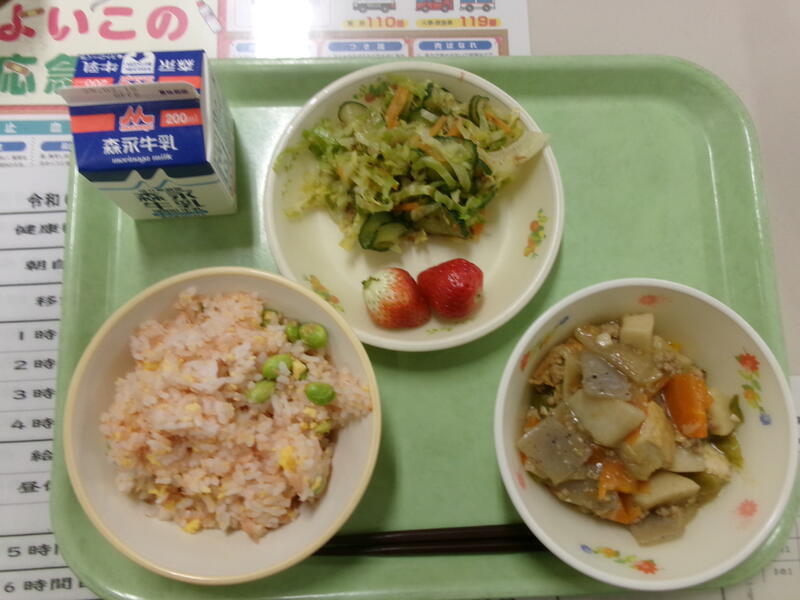 今日の給食:三食ごはん、里芋のそぼろ煮、梅あえ、いちご(2個)、牛乳