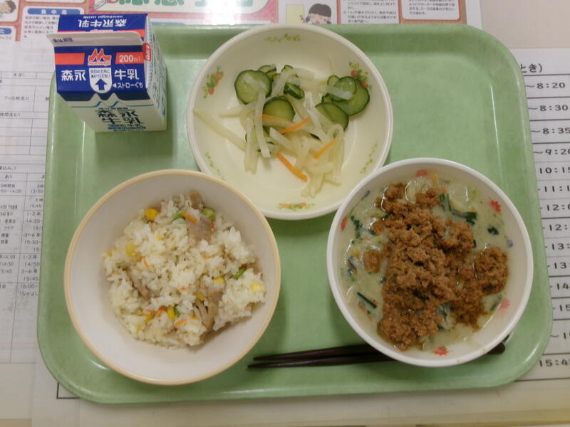今日の給食:五目チャーハン、タンタン麺、ナムル、牛乳