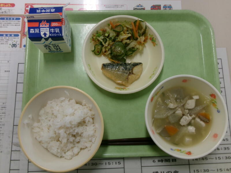 今日の給食:麦ごはん、けんちん汁、さばのみそ煮、おかかあえ、牛乳