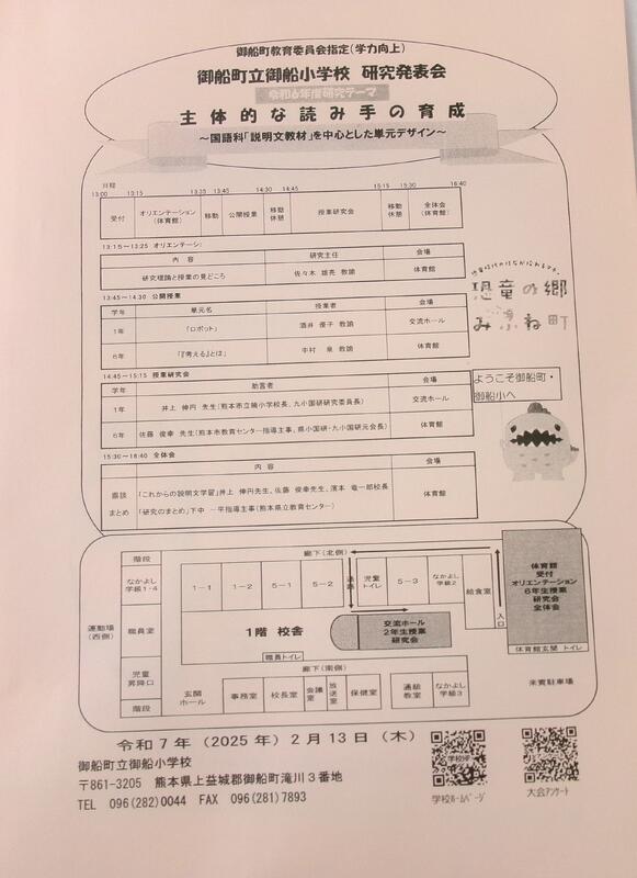 今週木曜日、2月13日に御船小学校は、御船町教育委員会の指定を受け「学力向上」の研究発表会を開催します。これまで、濱本竜一郎校長を中心に研究を進めてきました。公開授業では2年生の酒井優子教諭が、国語「ロボット」を交流ホールで、6年生の中村泉教諭が、国語「『考える』とは」を体育館でおこないます。全体会では鼎談(ていだん:3人が向かい合って話をすること)で、佐藤俊幸先生(元熊本県小学校国語教育研究会会長・元九州国語教育研究会会長)、井上伸円先生(現熊本市立楠小学校長、現九州国語教育研究会委員長)、本校濱本竜一郎校長(現熊本県小学校国語教育研究会会長)の3人で「これからの説明文学習」について話されます。次の日からでも授業に役立つ話だと思います。尚、御船小学校は御船インターチェンジから車で約10分、近くには「恐竜博物館」「御船町役場」「御船中学校」「カルチャーセンター」等があります。本校近くは道が細くなっていますので、ご注意ください。駐車場はカルチャーセンター(40台)、本校体育館前(20台)、運動場(40台)を確保しています。車の出入りは体育館近くの門1つになります。お待ちしています。