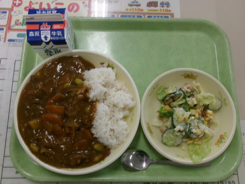 今日の給食:カレーライス、カリカリ豆サラダ、牛乳