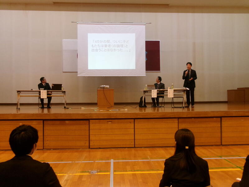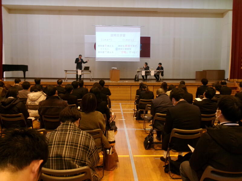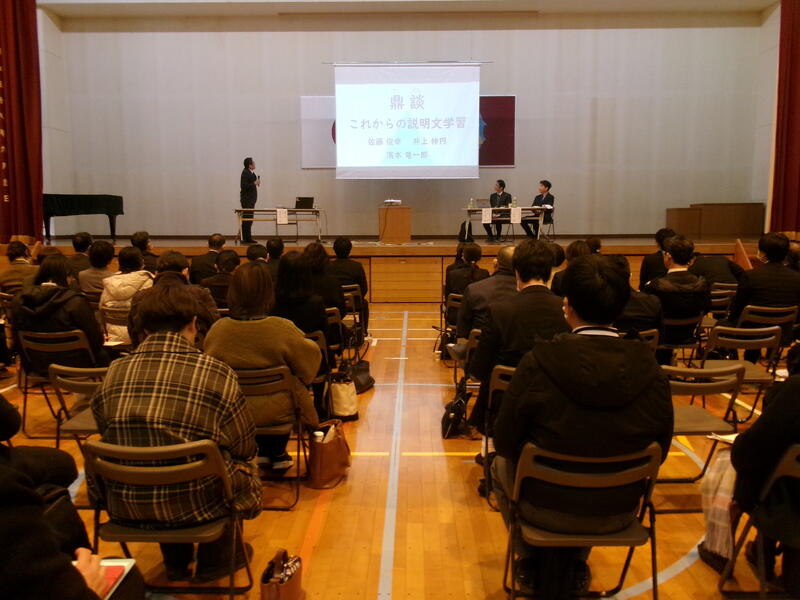 【15:30~16:40全体会 鼎談「これからの説明文学習」:佐藤俊幸先生(熊本市教育センター指導主事、元熊本県小学校国語教育研究会会長・元九州国語教育研究会会長)・井上伸円先生(現熊本市立楠小学校長、現九州国語教育研究会委員長)・本校濱本竜一郎校長(現熊本県小学校国語教育研究会会長)、まとめ下中一平指導主事(熊本県立教育センター)】