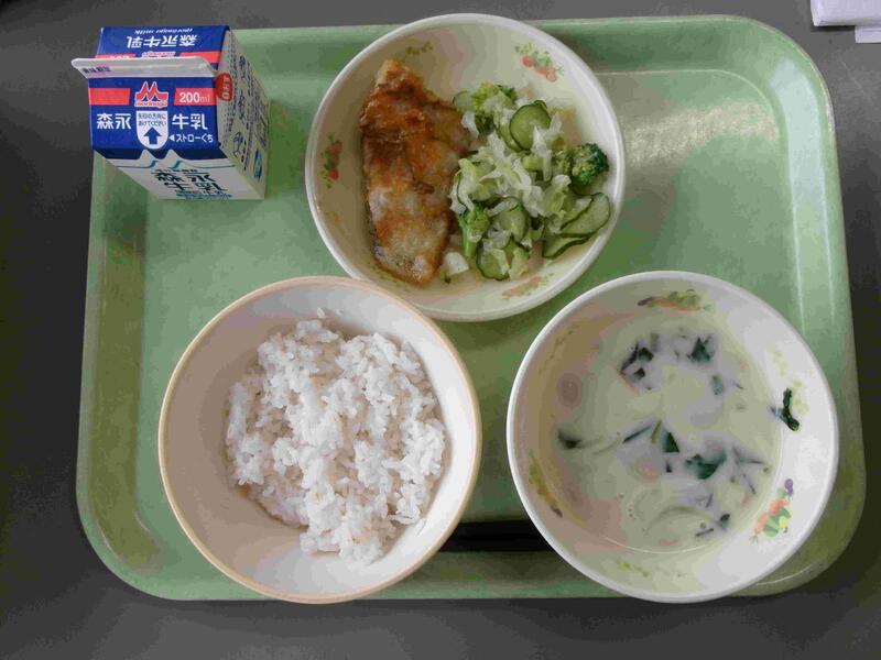 今日の給食:麦ごはん、ミルクスープ、タラのにんにくソース、グリーンサラダ、牛乳