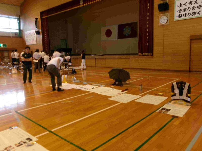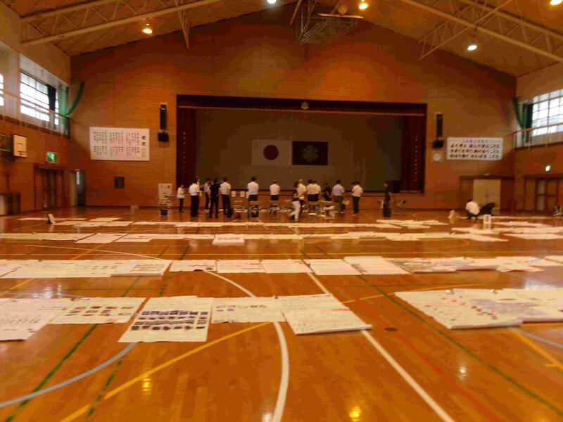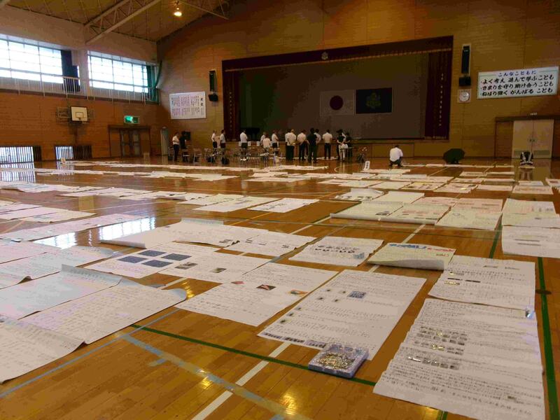 【午後から本校体育館で、上益城郡科学研究物展示会及び発明工夫展がおこなわれました。多くの作品が体育館フロアーに並べられてありました。力作ぞろいでした。】