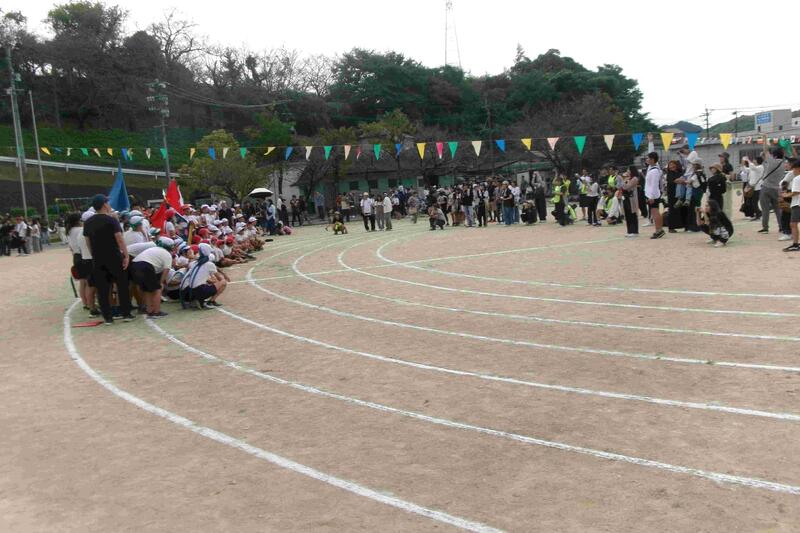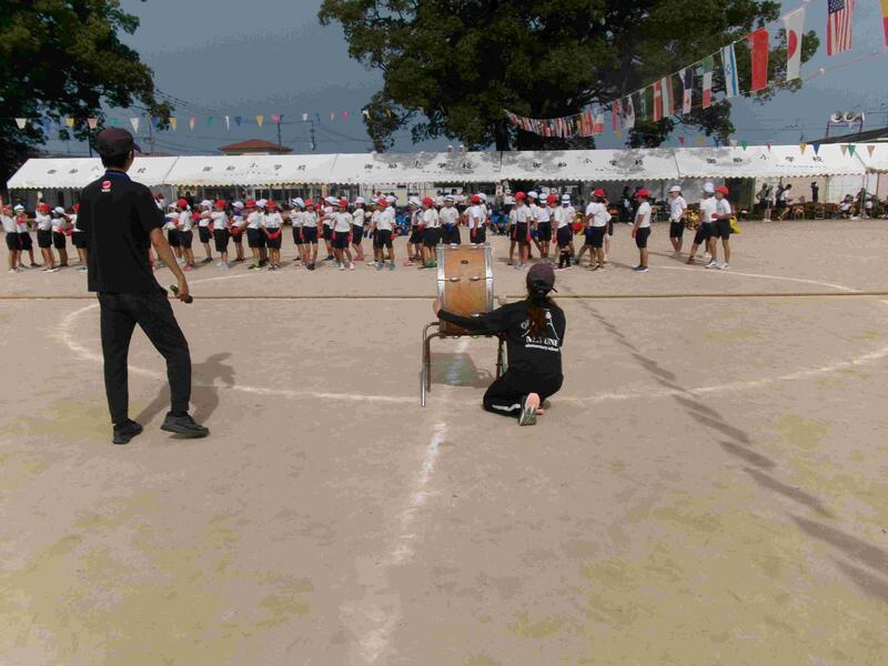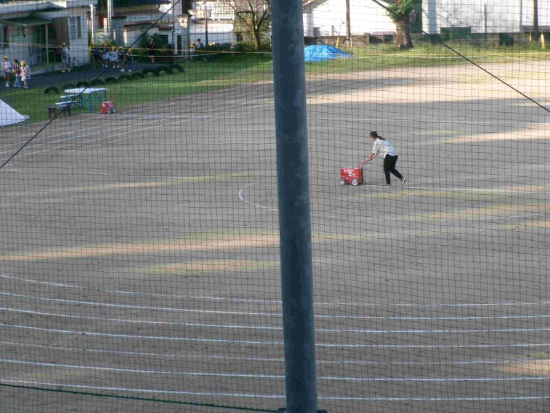 【職員は毎朝7時30分頃から、運動場のライン引きと本部テントをたてる作業をおこなっています。】