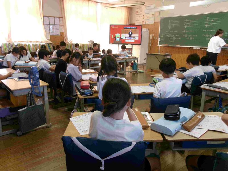 【4年1組は音楽で、リコーダーの練習をしていました。】