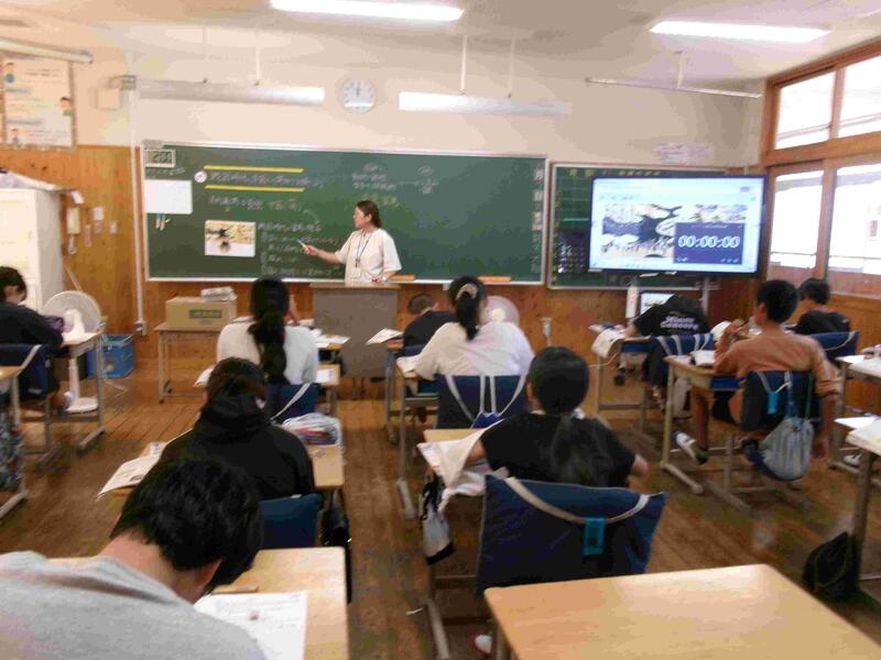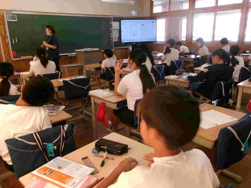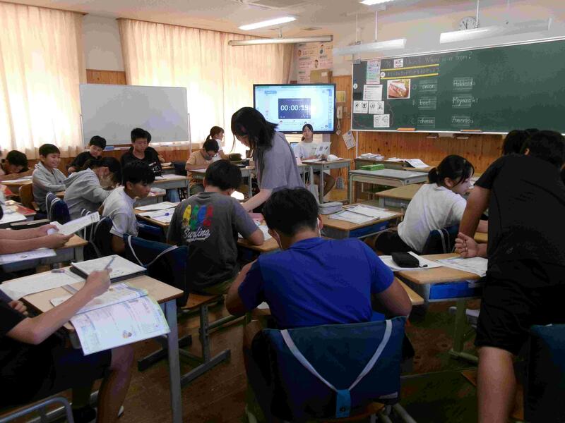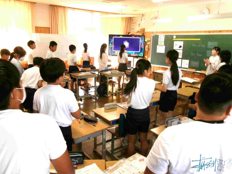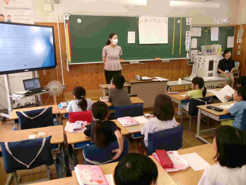 【1年2組は、アンジェリカ先生と楽しく英語活動をしていました。ハロウィンの画像も出ていました。】