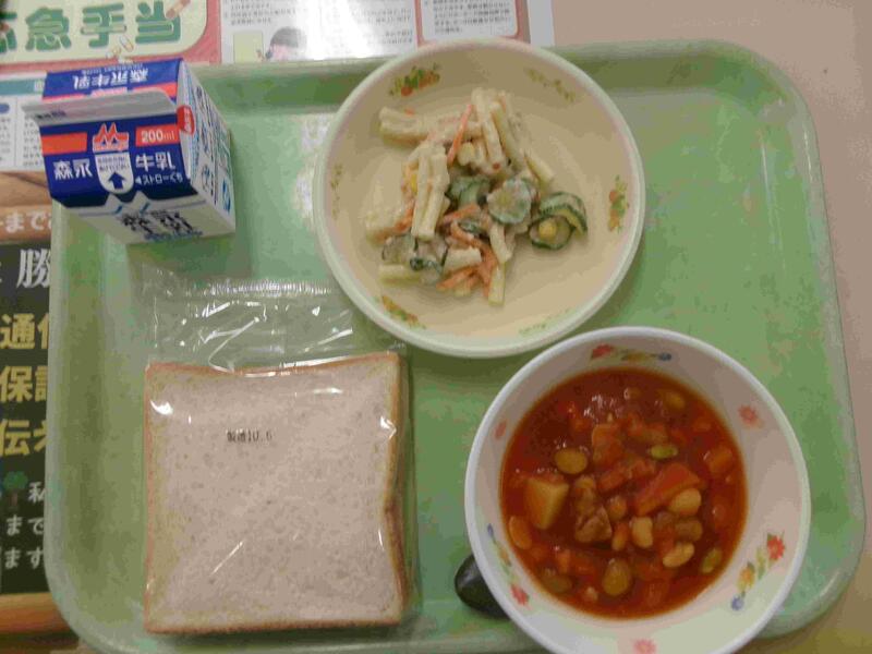 今日の給食:セルフサンドイッチ、ポークビーンズ、マカロニサラダ、みかん果汁、牛乳
