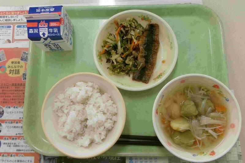 今日の給食:麦ごはん、つみれ汁、ピーマンの昆布あえ、さんまのかば焼き、牛乳