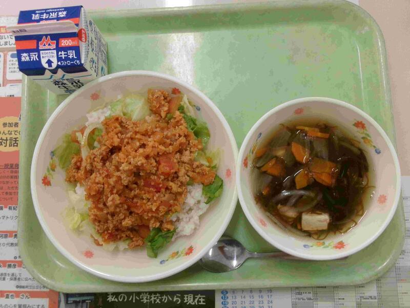 今日の給食:タコライス、もずくのスープ、タコライスの具、タコライスの野菜、牛乳