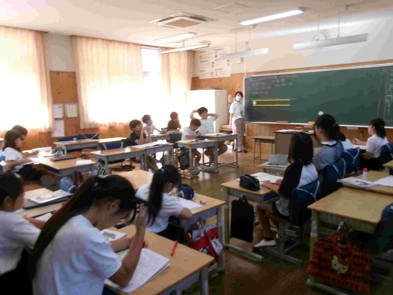 【現在5年生の算数は、わり算の商を分数で表す学習をしています。5年生頑張っています。映像は5年2組です。】