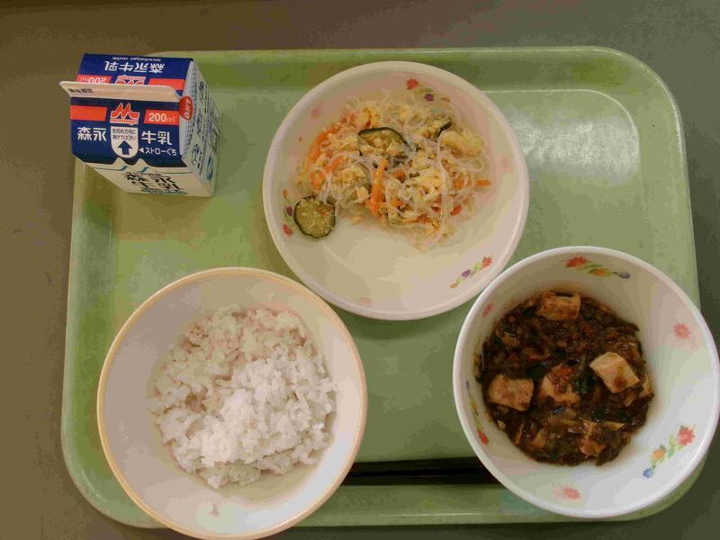 今日の給食:麦ごはん、にらマーボー豆腐、春雨のあえもの、牛乳