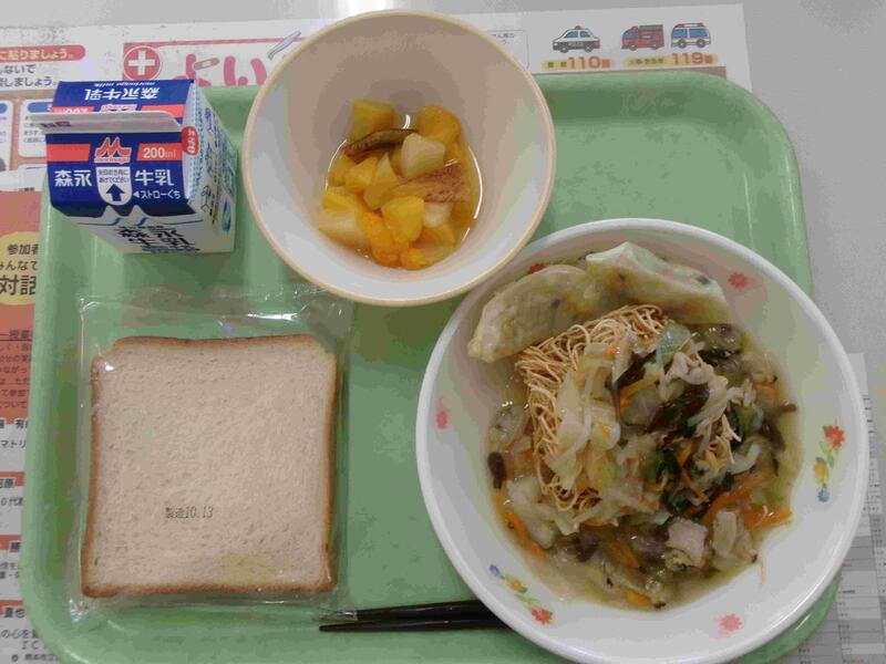 今日の給食:黒糖パン、パリパリ焼きそば、ぎょうざ(2ヶ)、柿のフルーツミックス、牛乳