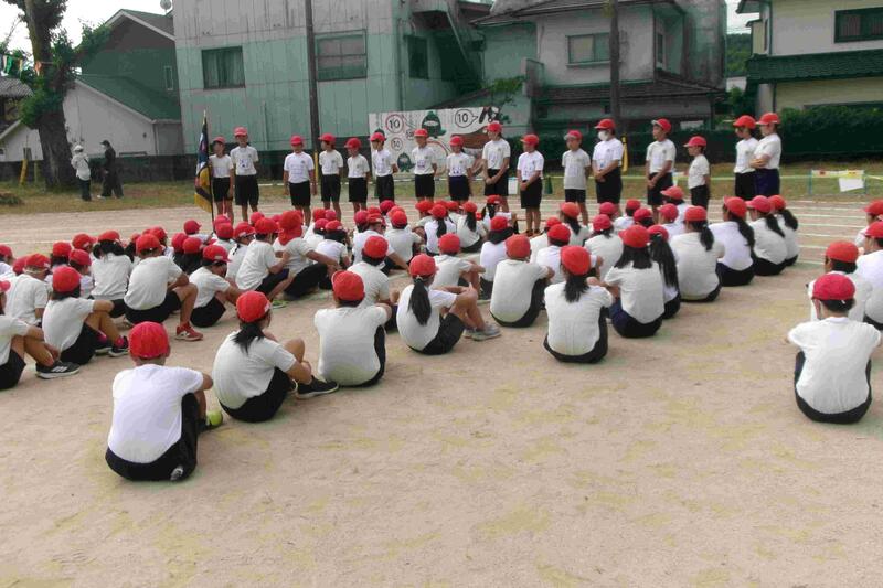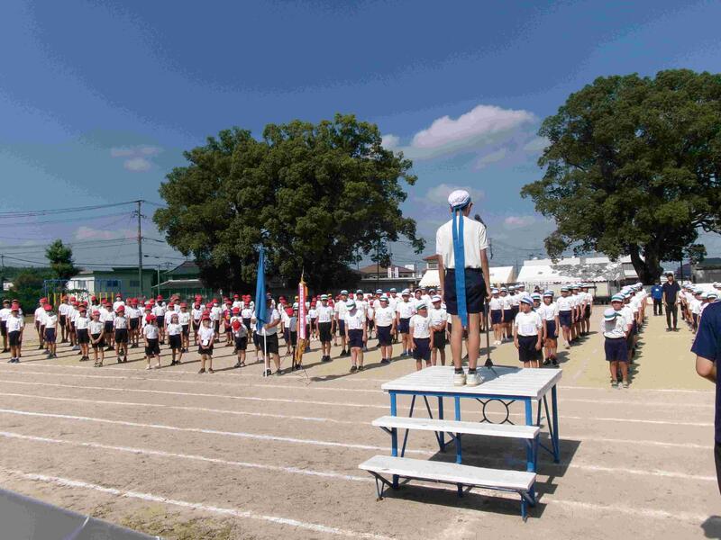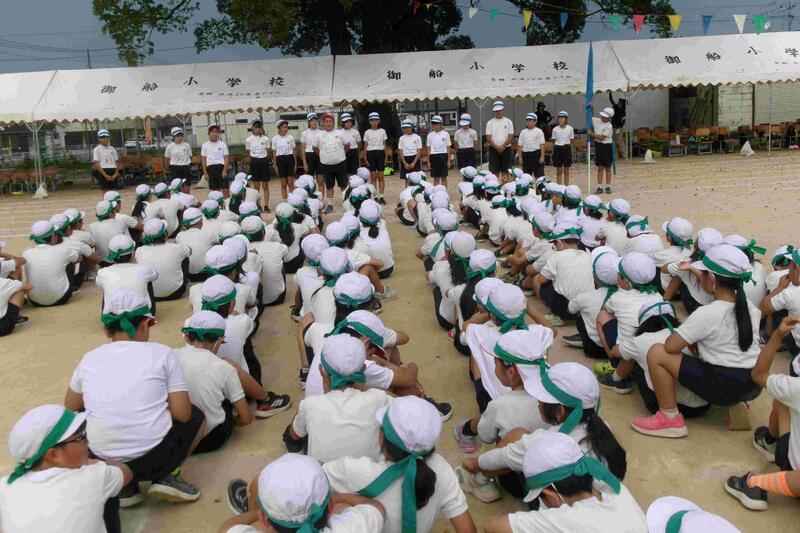 【3校時目、運動会全体練習がおこなわれました。開会式、閉会式、応援の練習です。途中には給水タイムも入れてあります。暑い中よく頑張る御船っ子たちです。】