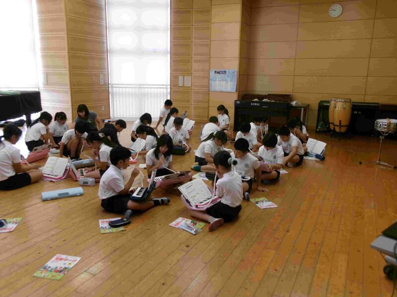 【5年2組は音楽室で、「和音のひびき」のところを鍵盤ハーモニカで練習していました。】
