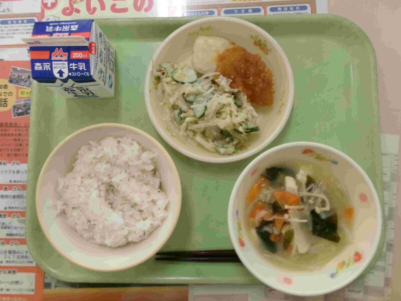 今日の給食:麦ごはん、豆腐のみそ汁、魚のおろしソース、ごまネーズあえ、牛乳