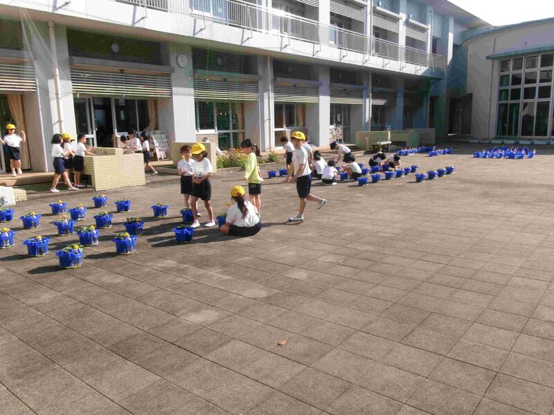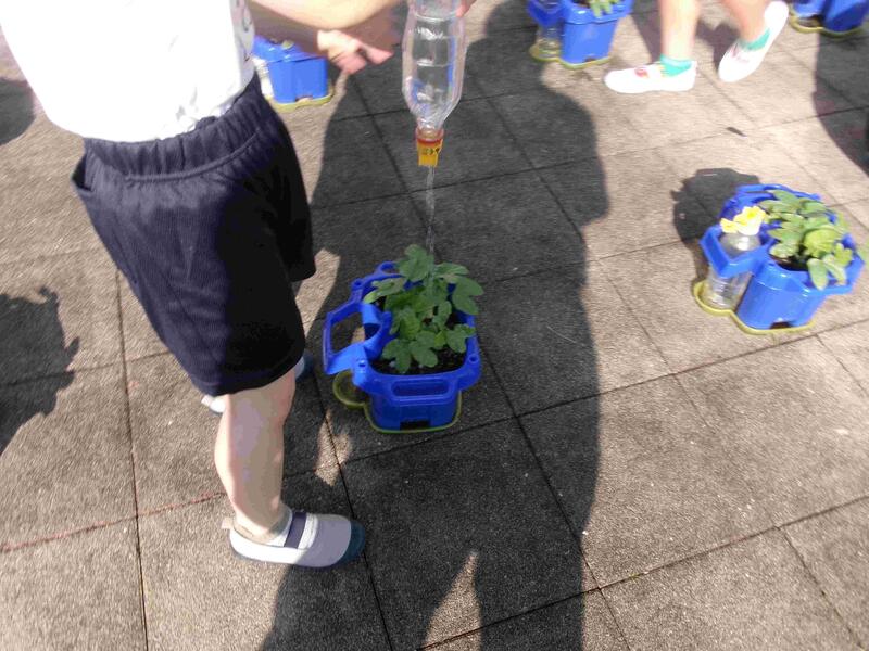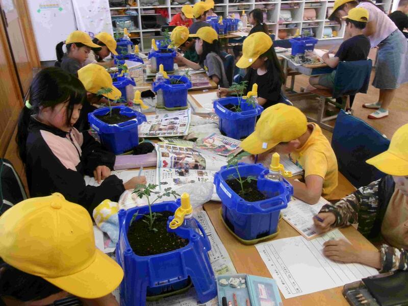 【1年生の朝からの日課の1つに、アサガオの水やりがあります。だいじにお世話をしています。日に日に大きくなっています。】