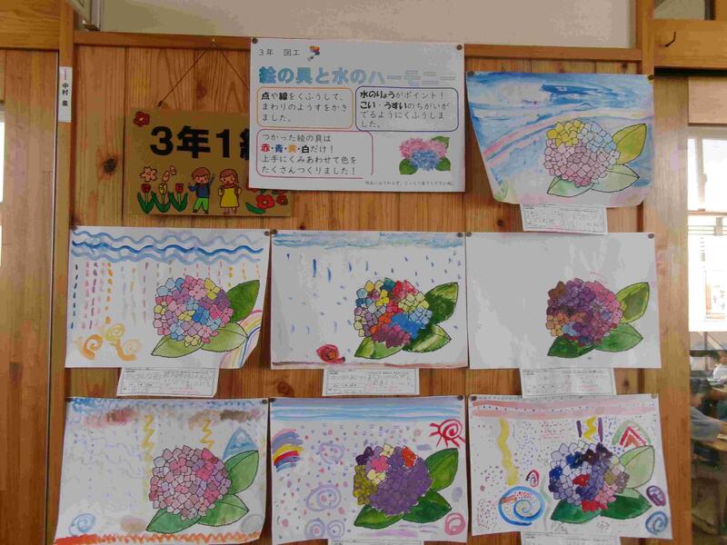 【3年生が描いた「あじさい」です。色がとてもきれいです。】