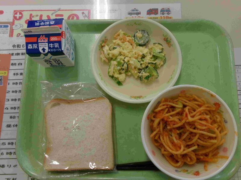 今日の給食:セルフサンドイッチ、スパゲッティミートソース、卵サラダ、牛乳