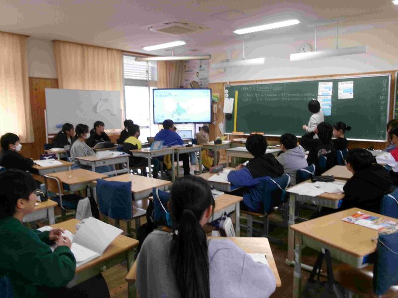 【6年2組:算数で「およその面積と体積」を学習していました。北海道を三角形と考え、およその面積を求めていました。】