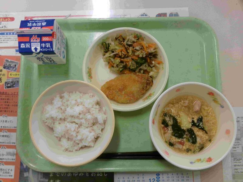 今日の給食:麦ごはん、トマトかき玉汁、しいらフライ、即席漬、牛乳