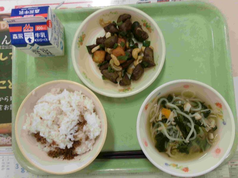 今日の給食:麦ごはん、魚そうめん汁、レバーと高野豆腐の揚げがらめ、出汁がらふりかけ、牛乳