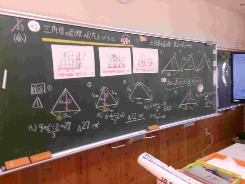 【5年生の算数です。ホームページ担当者の私が、5年生と3年生の算数専科をしています。12月に入院したため、担任の先生方の協力により単元の入れ替えをしました。現在5年生は、三角形の面積を学習しています。三角形の用紙を組み合わせたり切ったりし、平行四辺形にかえたり、長方形にかえたりして、三角形の面積の公式を導きだしました。】