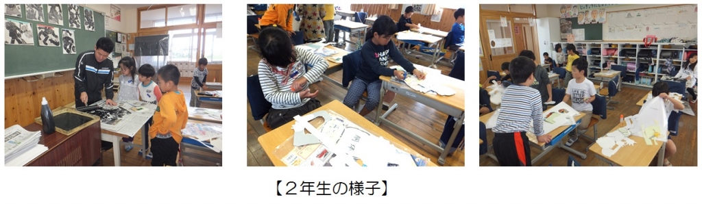 2年生の様子についてご紹介します。この日は図工で「紙版画『うつして 見つけて』」の授業でした。「登り棒をしている自分」「カブトムシをつかんでいる自分」等、日常の場面を切り取って版画に表す学習です。子どもたちは紙をちぎることで、手首から肘、肘から肩、薬指の指先など、体の部分を細かく分け、それらを貼り合わせることで体全体を表現しました。