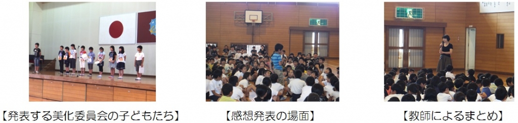 全校集会で行われた美化委員会の発表について、ご紹介致します。委員長の「一人一人が生活しやすい学校にするために、環境づくりをがんばりましょう。」という一言に表れるように、今回の内容は、全児童で学校を美化することへの呼びかけでした。誰もが親しみを持てるようにと、ドラえもんのキャラクターに扮して、劇を行う美化委員の子どもたち。発表全体に、工夫が感じられました。校内の環境美化とともに、「エコバッグ」「4R(リデュース、リユース、リフューズ、リサイクル)」等の紹介があり、物を大切にする心についても学んでいます。子どもたちによる感想では、「これから環境について考えていきたいと思いました。」「牛乳パックのリサイクルから頑張りたいと思います。」という声が上がりました。