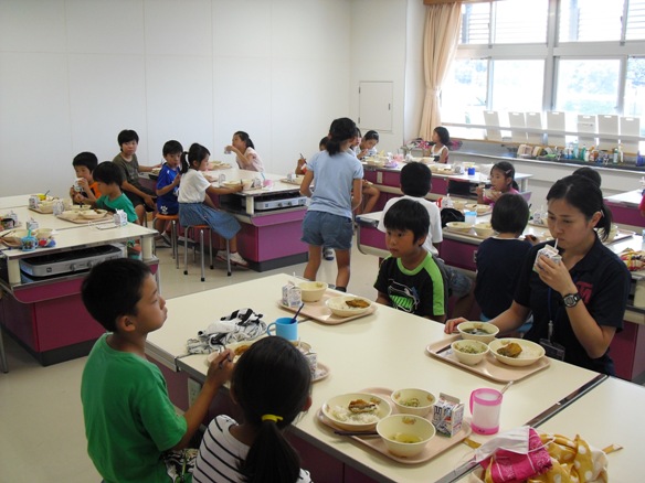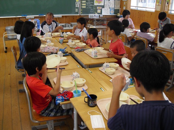 7月15日(金)第1回目のファミリー給食がありました。ファミリー給食とは、縦割り班で1年生から6年生が各班で一緒に給食を楽しく食べて、親睦を深めようというものです。