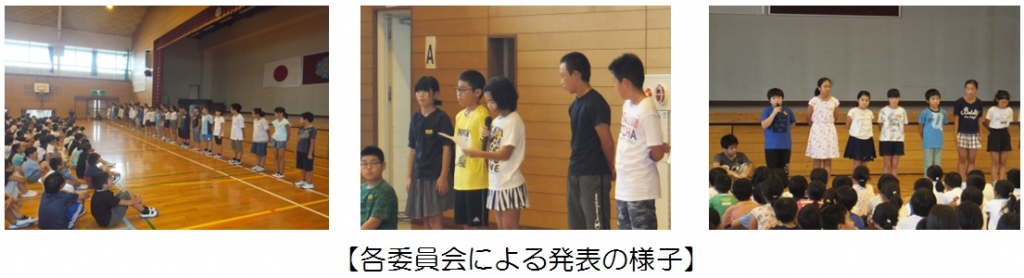 9月の児童集会では各委員会から2学期の目標と取組について紹介がありました。美化委員会から「すみずみまできれいにし、黙掃掃除を身につけましょう。」、放送委員会から「明るく放送して、みんなをハッピーにします。」、図書委員会から「みんなに沢山本を読んでもらい、図書室すべてを大切に扱ってもらいたいです。」等、それぞれが思いを込めて力強く伝えました。