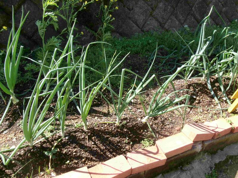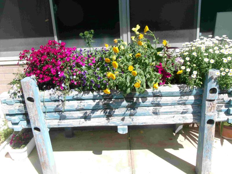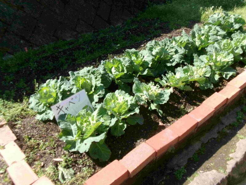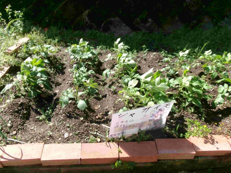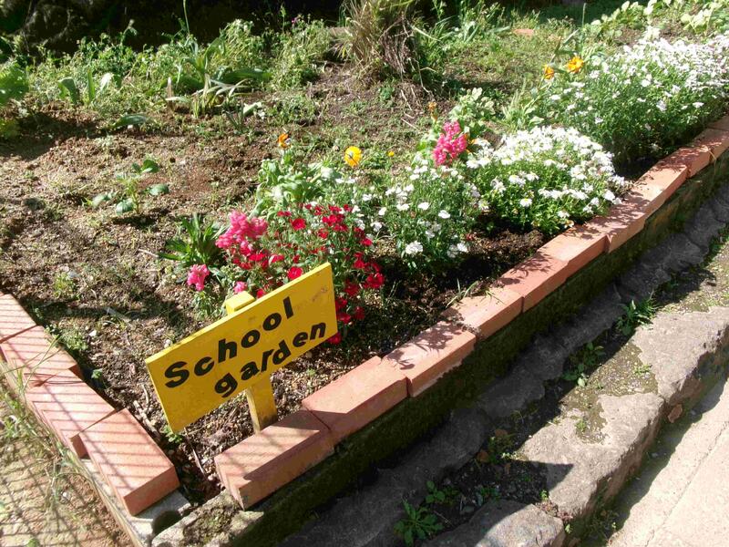 【花壇の様子です。きれいなお花が咲いています。学年園では理科で使う、キャベツ(あお虫の観察)やジャガイモ(デンプンの学習)が育っています。】