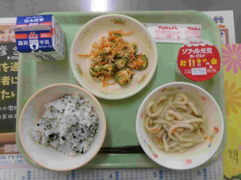 今日の給食:わかめごはん、五目うどん、にんじんサラダ、ヨーグルト、牛乳