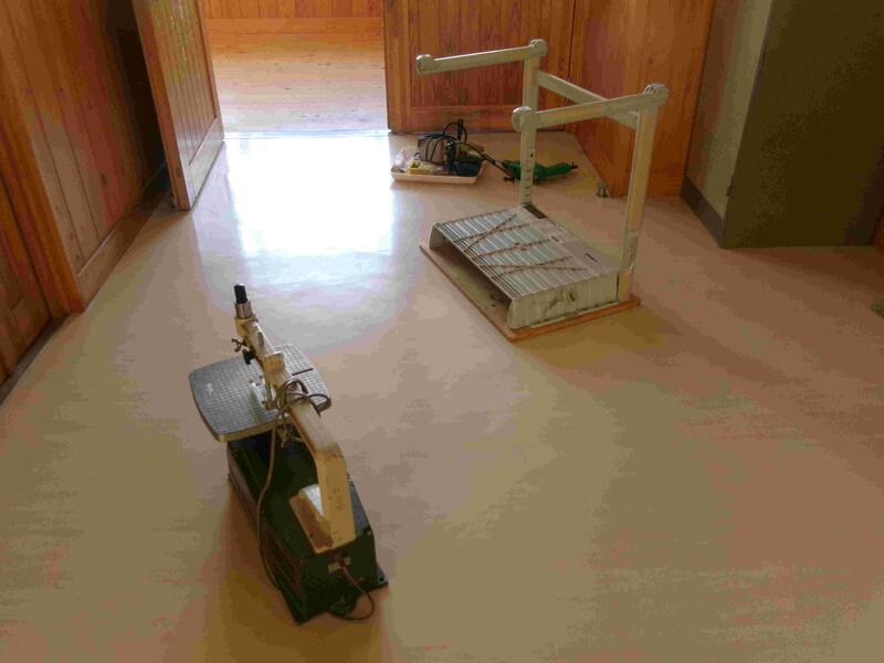 【午後からは電動糸のこを机に固定する準備をおこないました。4台机に固定する予定です。】