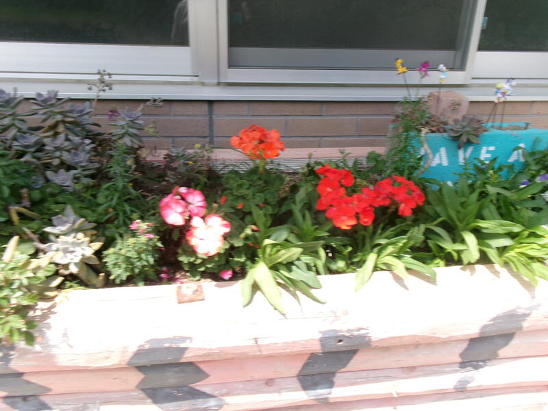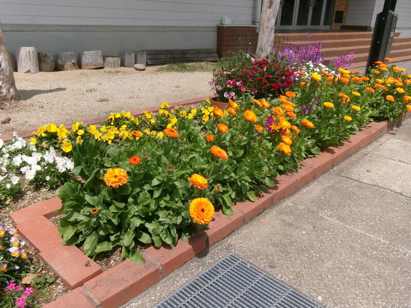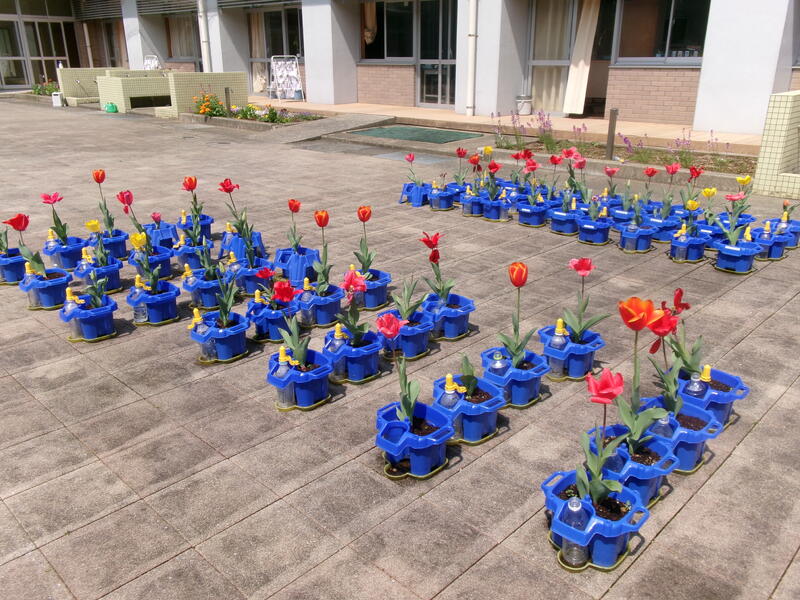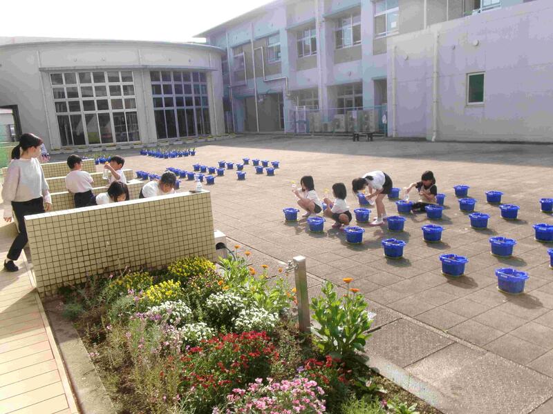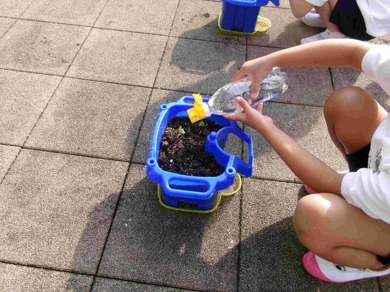 【先日、1年生はあさがおの種を植えました。朝から水やりをしています。かわいい子葉が出てきました。】