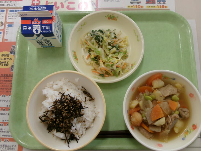 今日の給食:麦ごはん、五目肉じゃが、ごまネーズあえ、手作りひじきふりかけ、牛乳