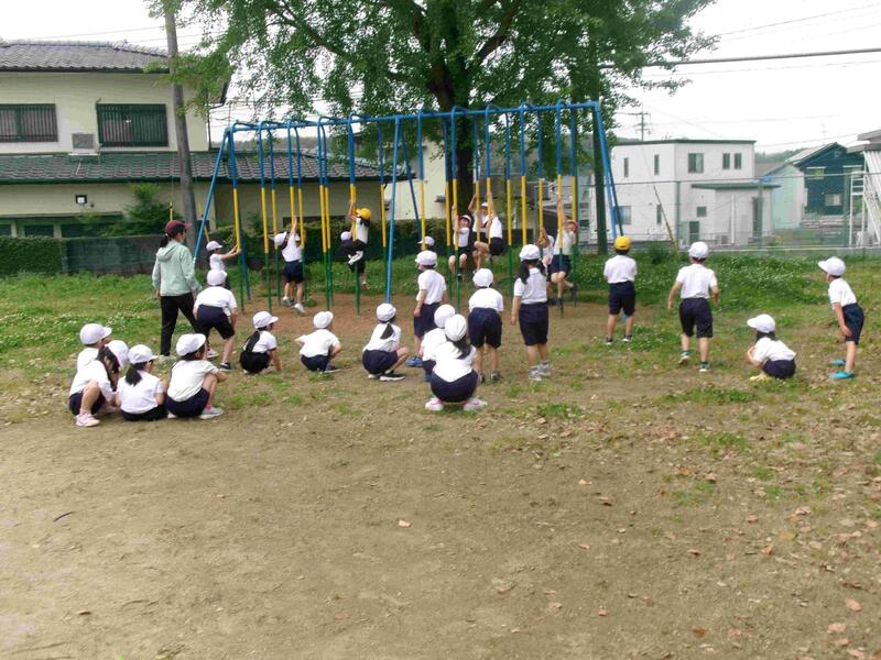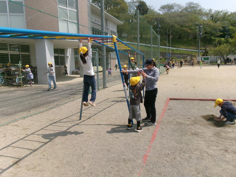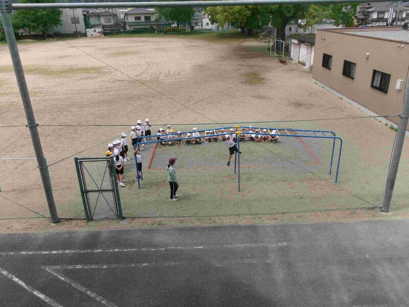 【1年2組:体育 遊具をつかって体力作りをしていました。「がんばれ、がんばれ」の応援の声がこだましていました。】